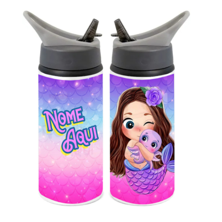 • Squeeze de Alumínio Sereia Personalizado com Canudo Volta às Aulas